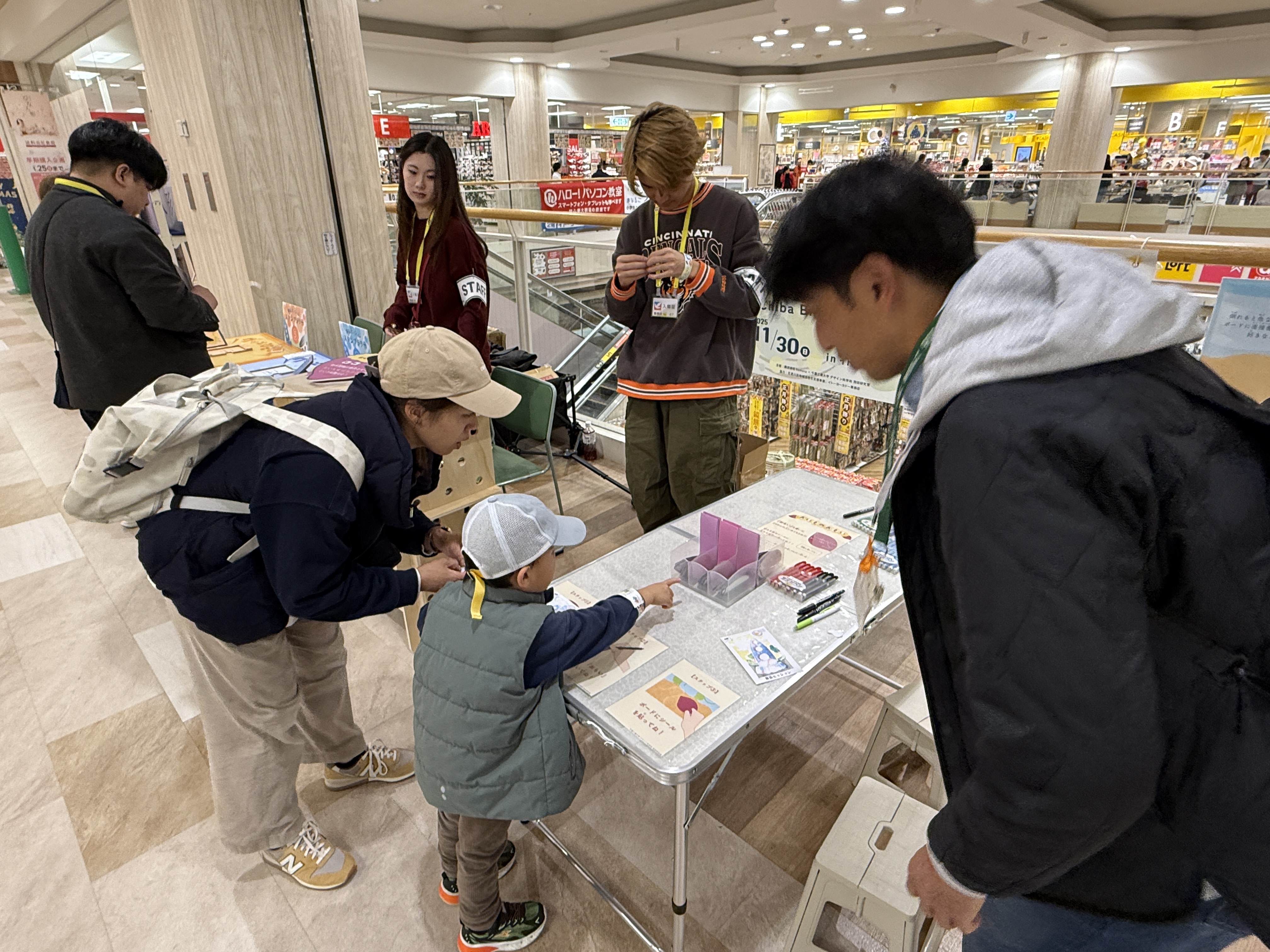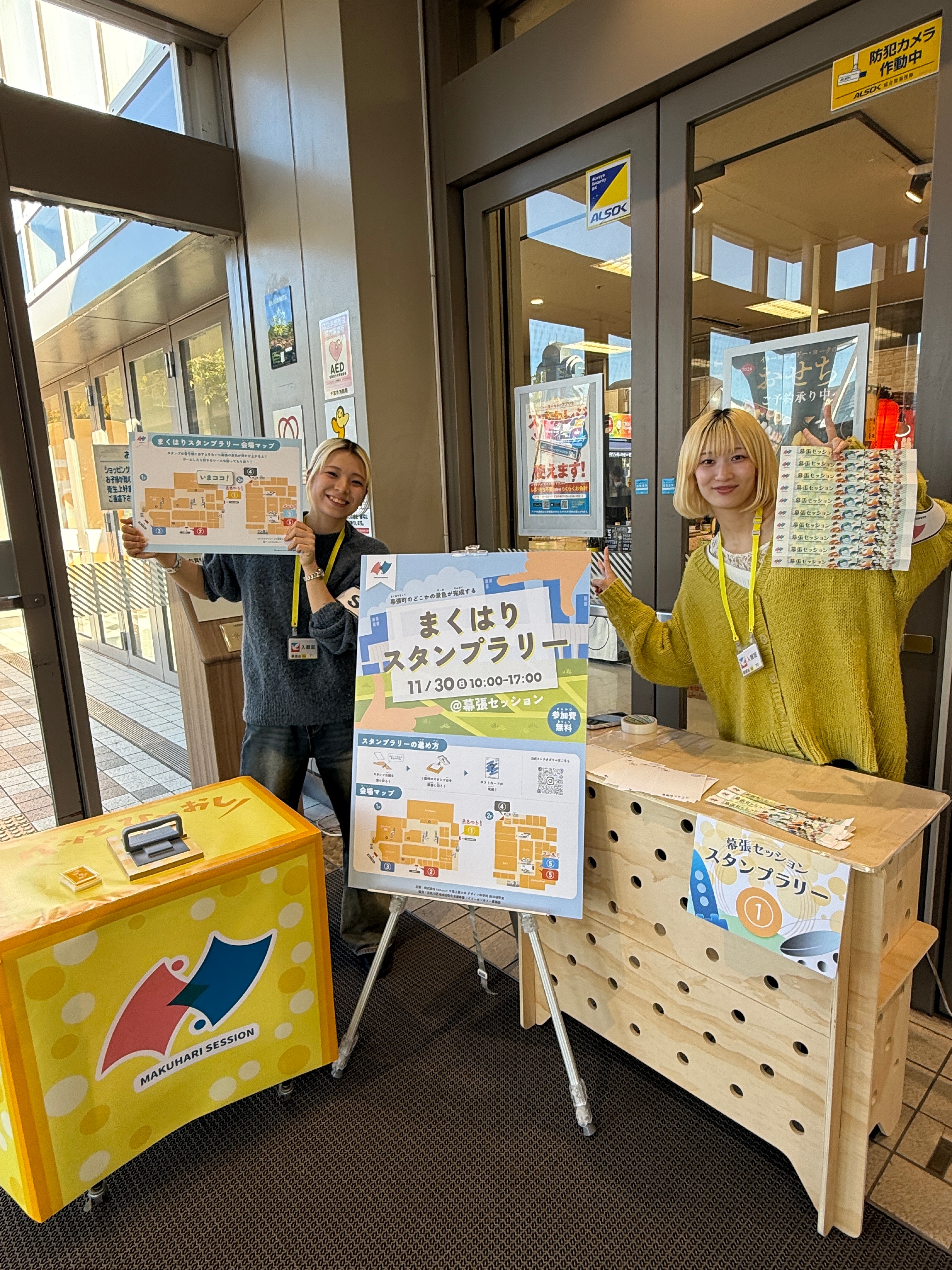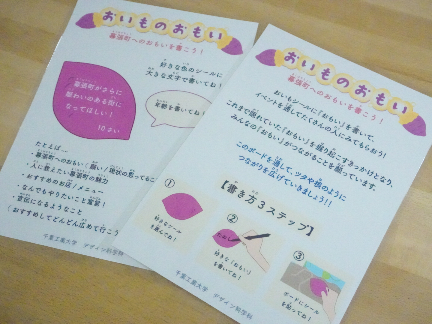 デザイン科学科・西田研究室では、地域住民や企業、行政と連携しながら、学生が主体となって地域課題に向き合うプロジェクトに取り組んでいる。その一つが、2025年11月30日に開催された「幕張セッション×Chiba Bluegrass Festival Spin-off」への参画である。 本プロジェクトは、昨年度に実施した北習志野商店会との産学連携イベント「きたならマーケット」をきっかけに、「幕張町でも地域活性化に取り組めないか」と声をかけていただいたことからスタートした。幕張町は、若年層の人口流出などを背景に「消滅可能性都市」とも言われる地域であり、地域の魅力を再発見し、将来につなげていくことが課題とされている。 学生たちはまず、幕張町を実際に歩き、現地調査を通して町の魅力や課題を把握した。その後、地域住民、商店関係者、イベント発起人である株式会社hamoru、行政関係者と対話を重ね、「幕張町のありたい姿」を共有した。その中から、イベント当日に人と人、人とまちのつながりが生まれる二つの施策を提案した。 一つ目は「幕張セッションスタンプラリー」である。スタンプを重ねて押すことで、幕張町のどこかの風景が完成する仕掛けとし、参加者が町を歩きながら景色を探す体験をデザインした。完成した絵はポストカードとして持ち帰ることができ、次回以降のイベントへの期待にもつながる企画となった。 二つ目は、コミュニケーションボード「おいものおもい」である。幕張町が江戸時代に青木昆陽によってさつまいも栽培が成功した地であることに着目し、さつまいもをモチーフにした付箋紙に「自分の知っている幕張の魅力」を書いて貼る仕組みを考案した。直接言葉を交わさなくても、ボードを介して想いが共有され、自然な対話が生まれる場となった。 当日は、完成していくスタンプの絵や、付箋に書かれた言葉をきっかけに、初対面同士の会話が生まれる様子が多く見られた。子どもから高齢者まで、幅広い世代が学生の提案した仕掛けを楽しむ姿は、学生にとって座学では得られない貴重な学びの機会となった。